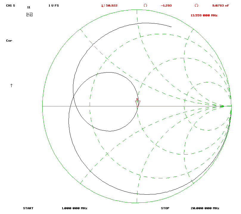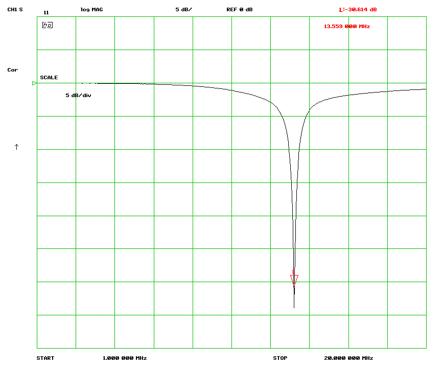 So anyway, my task was to calculate impedance matching circuit for RFID reader. My antenna had square shape with four winding coil. For the measurement I was using Hawlett Packard 8753A Network analyzer with 85046A S Parameter test set of the same brand. You can see my measurement results as S11 parameters on these pictures: